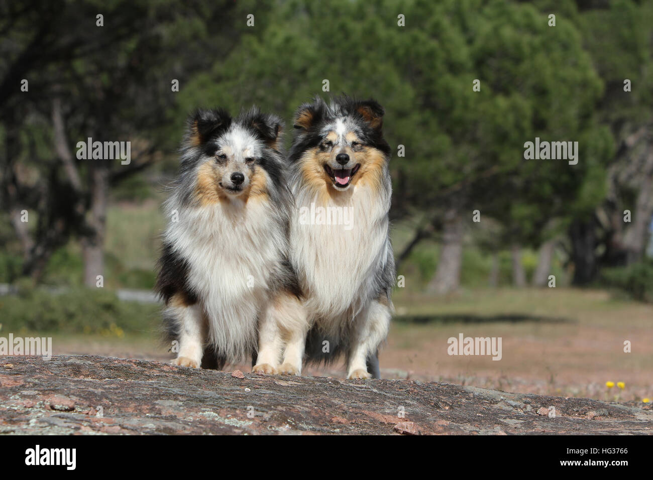 Shetland Sheepdog Hund Sheltie Zwei Erwachsene Stehend Auf Einem Rock Blue Merle Tricolor Dreifarbige Tri Color Dreifarbigen Stockfotografie Alamy